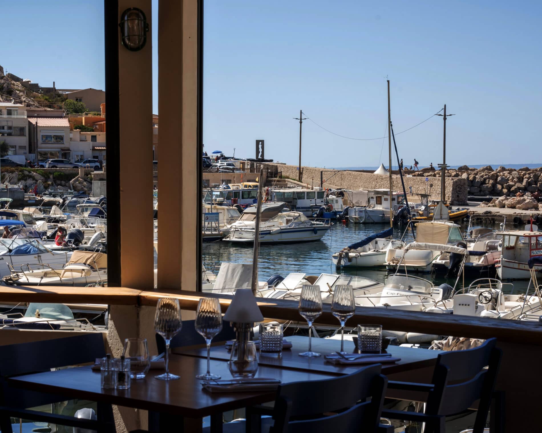Face au Cap Croisette et à Île Maïre, on prend le temps : un déjeuner en terrasse, un dîner au coucher du soleil, un verre au comptoir… et la sensation d’être “au bout du monde”, sans quitter Marseille.